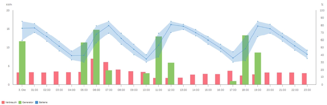 Bei geringer Last kann die Baustelle über die Batterie gespiesen werden. Über ein cleveres Batteriemanagementsystem wird der Generator bei Bedarf gestartet (Leistung notwendig, Batterie tief) und gestoppt. Mit der PowerBox kann die Laufzeit des Generators so massiv reduziert werden. Die Baustelle ist viel leiser, das Arbeiten für die Mitarbeiter viel angenehmer.